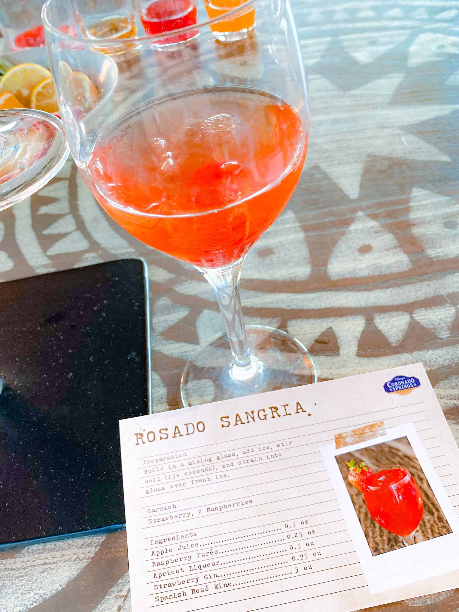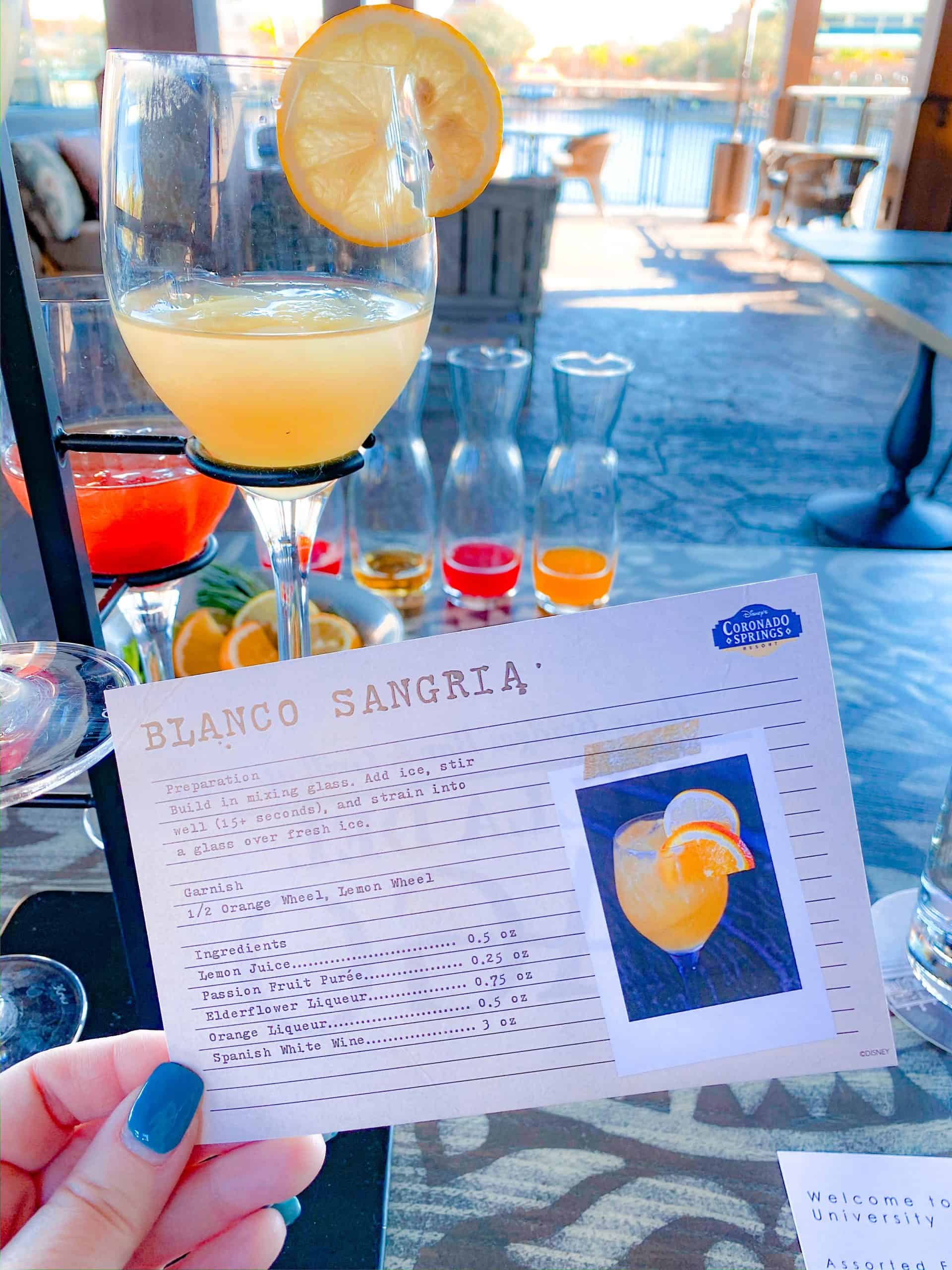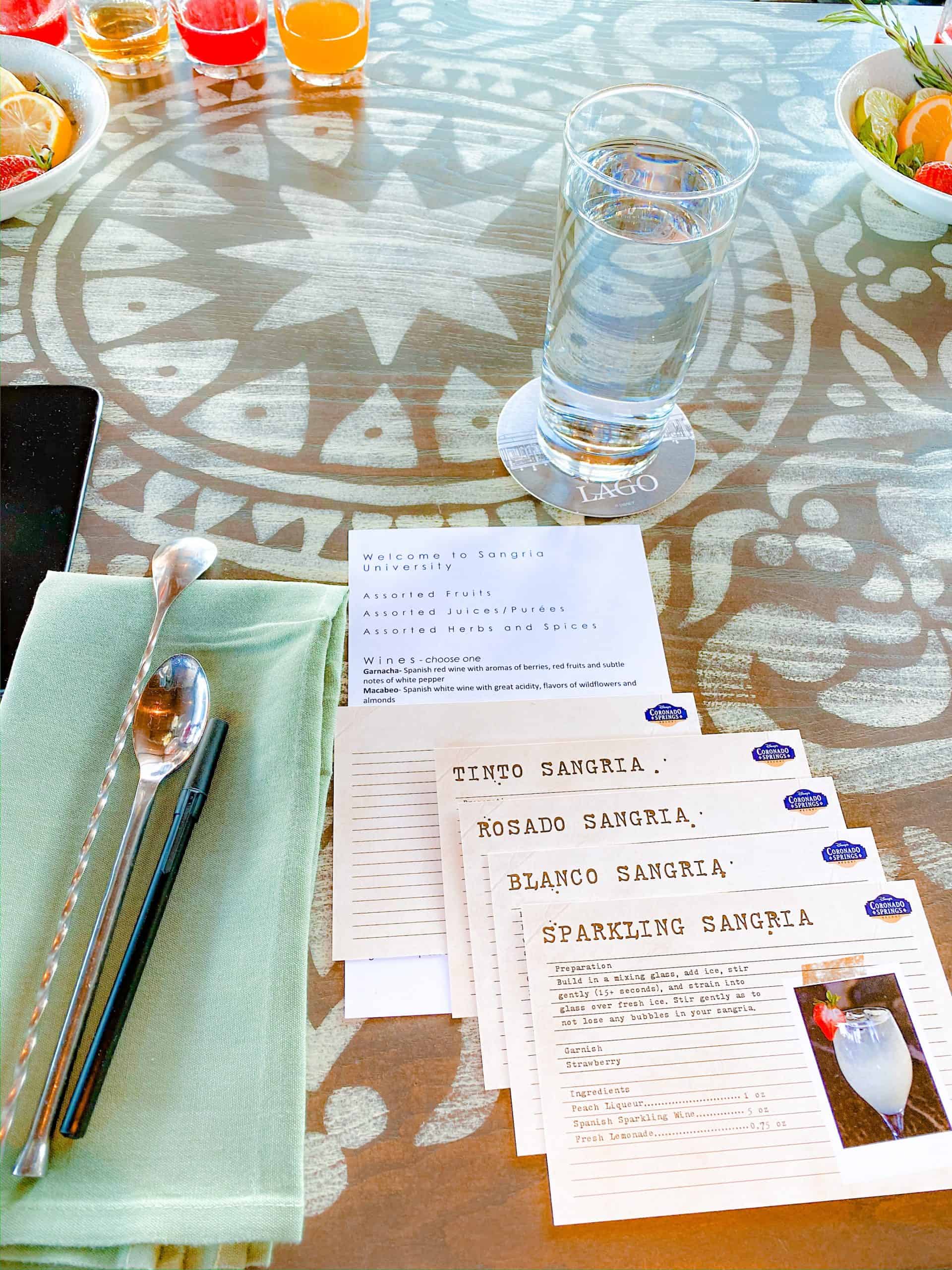 At this time, you cannot book on the My Disney Experience or on the Disney Dining line or WaltDisneyWorld.com. But, all you have to do to book Sangria University is call the Coronado Springs Resort Recreation line at 407-939-1004 to make the reservation. You can also email Three Bridges Bar & Grill directly at [email protected] to request a reservation or set up a private session. They also will accept walk-ups if you happen to be at Coronado Springs around that time, if they have any space for the current class.