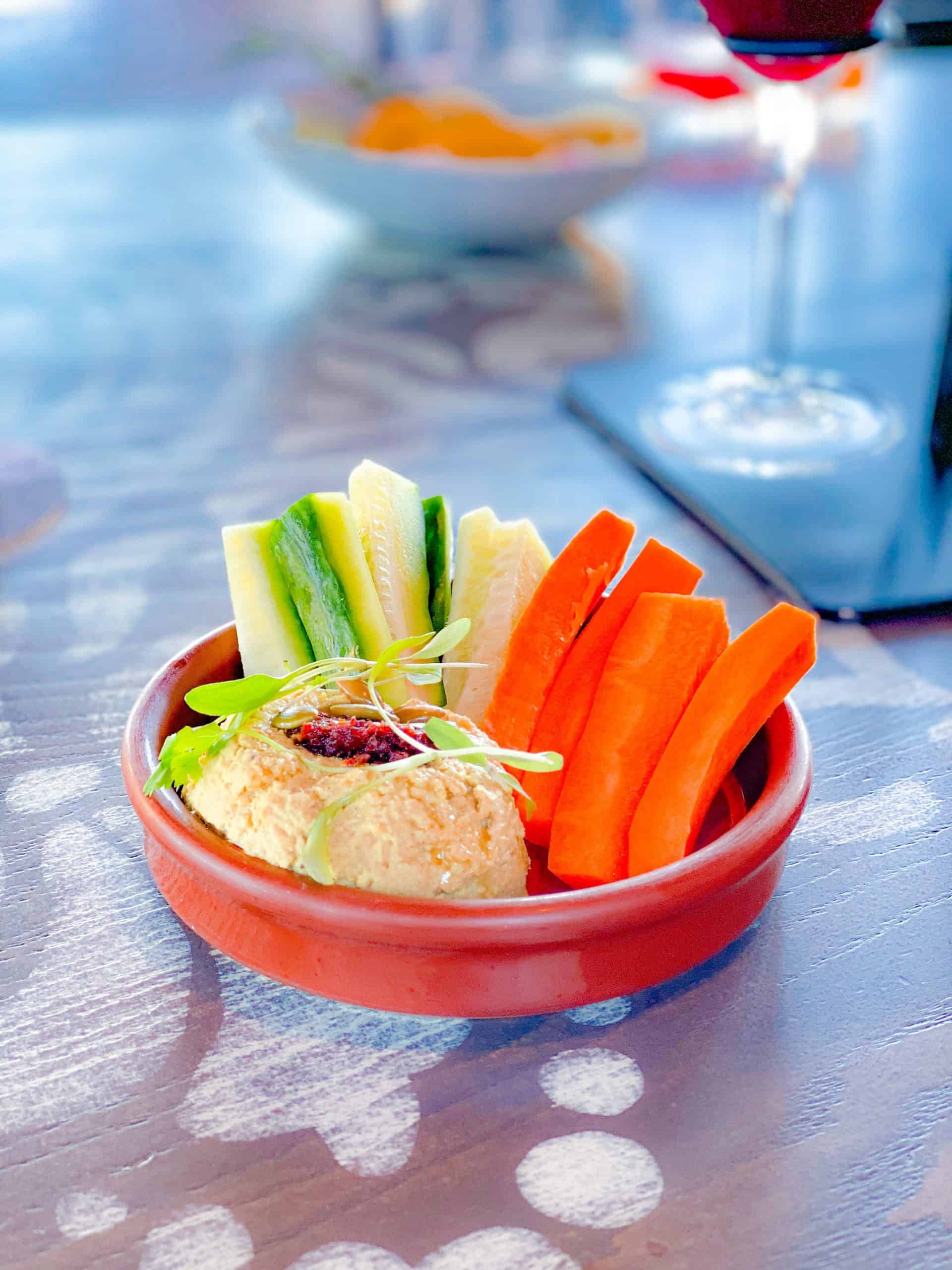 You also get an appetizer sample to enjoy during the class. The Lentil Hummus appetizer, which has a harissa topping and pepitas on top. It is normally served with pita triangles, but since I’m vegan, it came with sliced cucumber and carrot sticks to enjoy the hummus with.