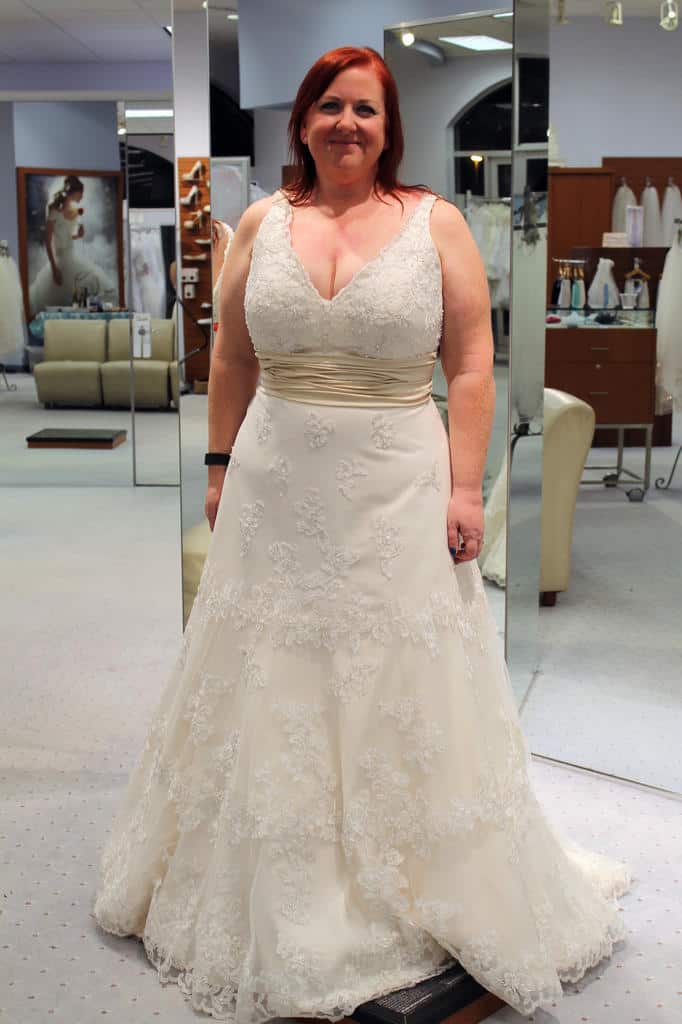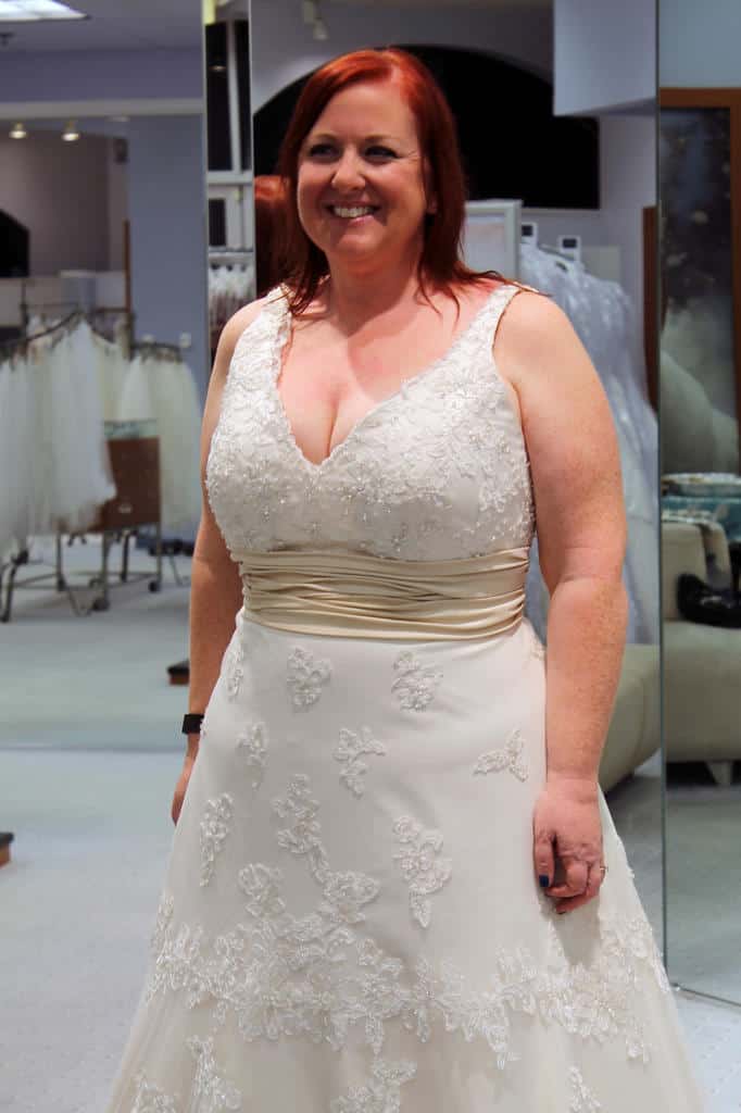 The first dress I tried on was one of the Alfred Angelo Disney Fairy Tale Weddings dresses – a Snow White. I had looked at all of the Disney dresses, and while I love princess ball gown style dresses, I knew that this time around (second wedding, 41 years-old), I wasn’t going to go that route. So the Snow White dress stood out to me as simple, yet different.