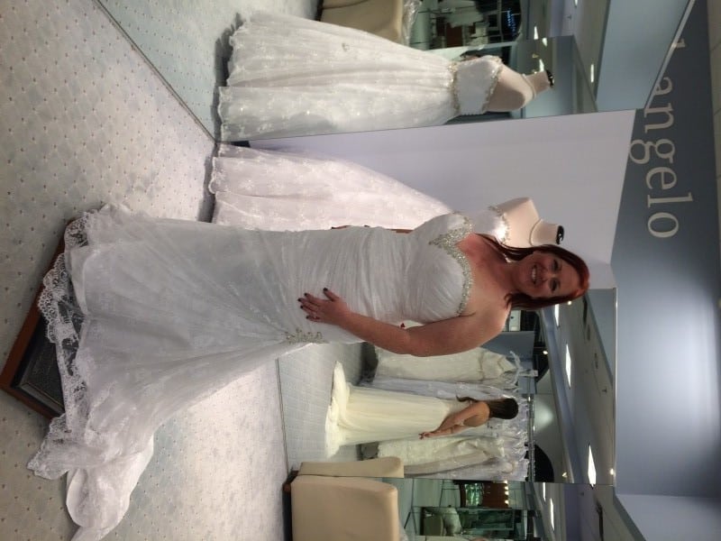 Well, first, Lee spoke for a few about how different Alfred Angelo was, and how they suggest dresses to try on based on the personality of the bride that shines through when first meeting her. With sizes up to 26, they really are for “Real Women,” making sure everyone looks and feels beautiful on her wedding day. I was feeling more at ease already. But…I still just let other bloggers go first and try some dresses on. It was fun to see so many different styles and designs. And interesting to see things that I may not ever have considered for myself, look perfect on another person there. It’s funny how one dress can say so much about you and let you shine through on a day you’ll remember forever. Then, it was my turn.