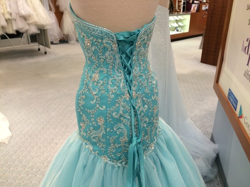 Next up, I happened to mention that I wondered what a mermaid style dress would look like on me, so Jocelynn brought one out for me to try. I really had never, ever considered wearing a mermaid dress, as I just didn’t think it would look flattering on me at all. In addition, I wanted to avoid a strapless dress because of that top heavy thing I mentioned above. So I was pretty shocked when I tried on style 2520 {I think it’s actually not this style but very close to it} and I actually liked it. Actually, I wasn’t sure I liked it, until I saw photos after the fact. Then I thought, “wow, that actually looks kind of good” which is not something that usually crosses my brain. {Click to enlarge all photos}