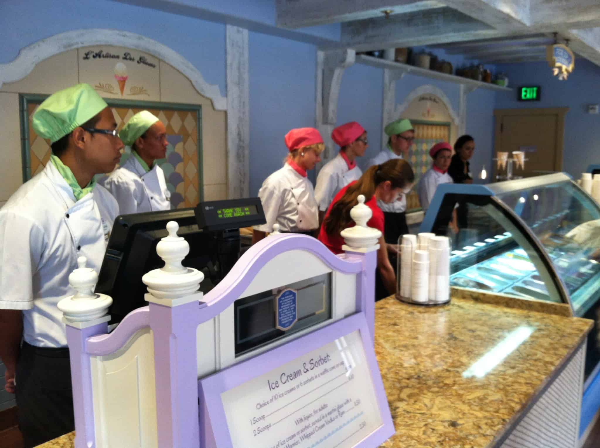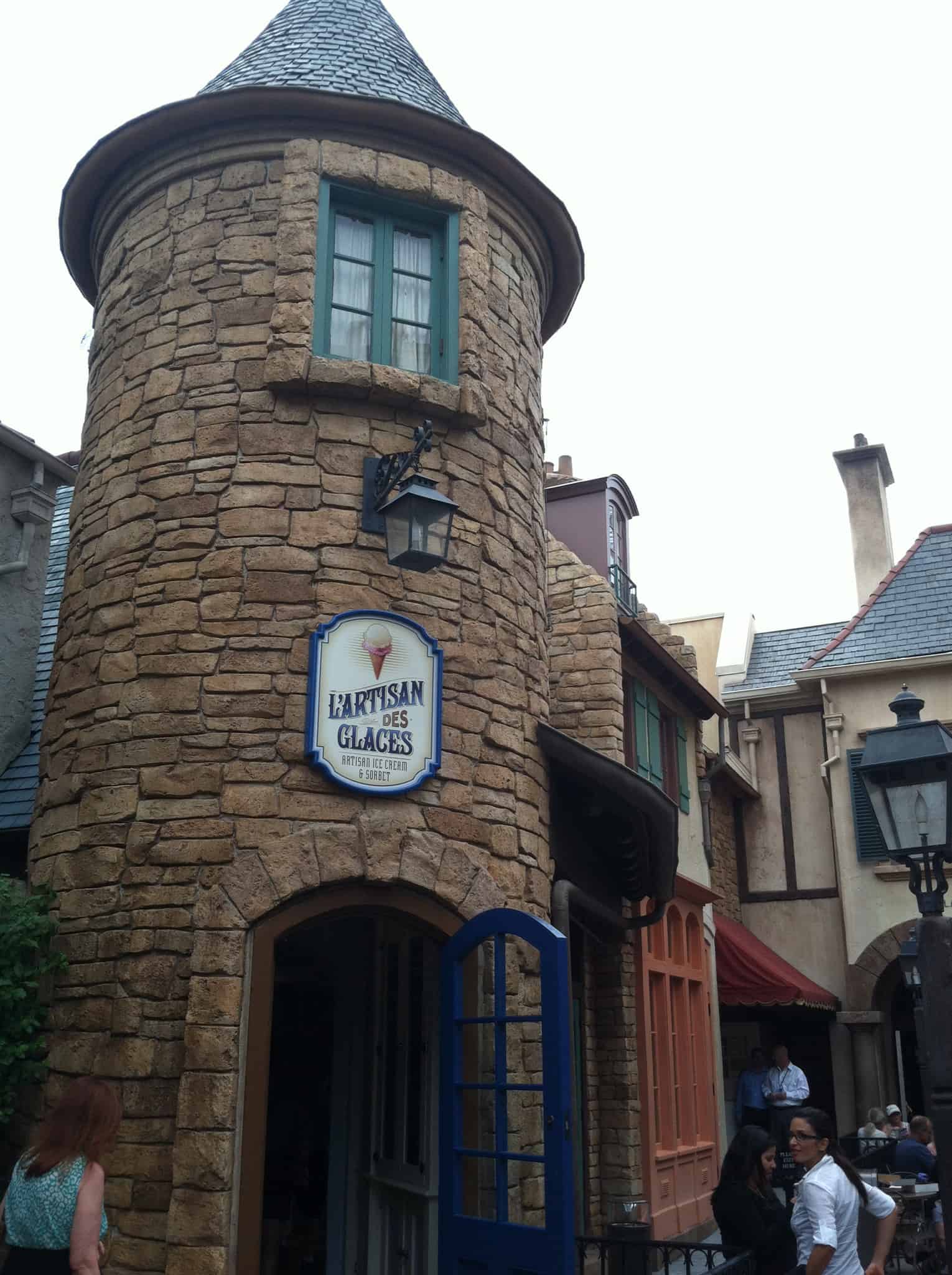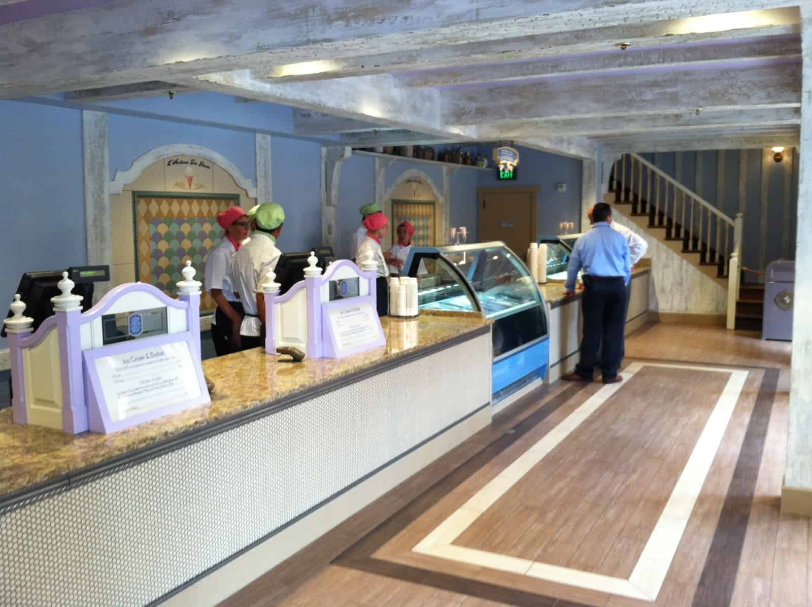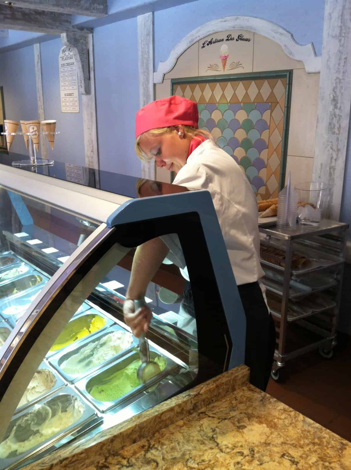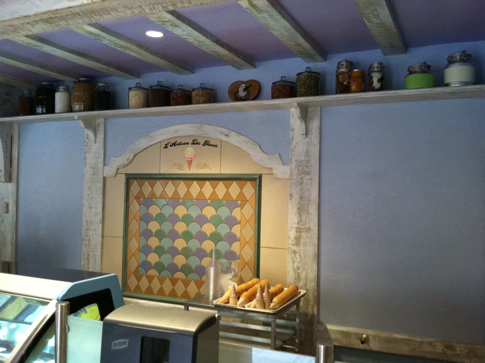 In the completely refurbished former patisserie area of France, L’Artisan des Glaces is set within a rustic, stone cottage building with turret (as before), but is open and airy inside, giving the feel of a country dairy shop. In fact, there are dairy touches throughout: milk bottles, milk canisters, even a milk bottle chandelier! The set up is different than before, with two registers allowing you to pay first, then choose a cup or a cone and pick your flavor. You then move down the line to pick up your order.