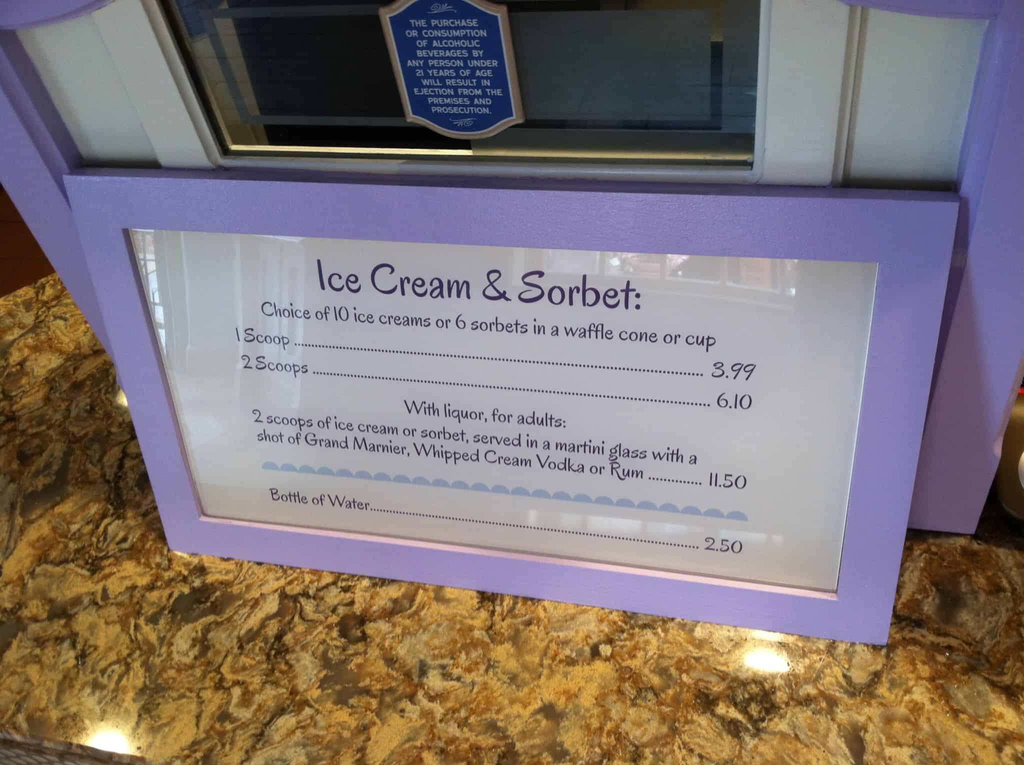 Unique to L’Artisan des Glaces is the adult-only sundae with liquor – 2 scoops of ice cream or sorbet served in a martini glass with a shot of Grand Marnier, Epic brand Whipped Cream Vodka, or Clement Rhum from Martinique for $11.50. One scoop of plain ice cream or sorbet is $3.99 while two scoops are $6.10 and are served in a waffle cone or a cup.