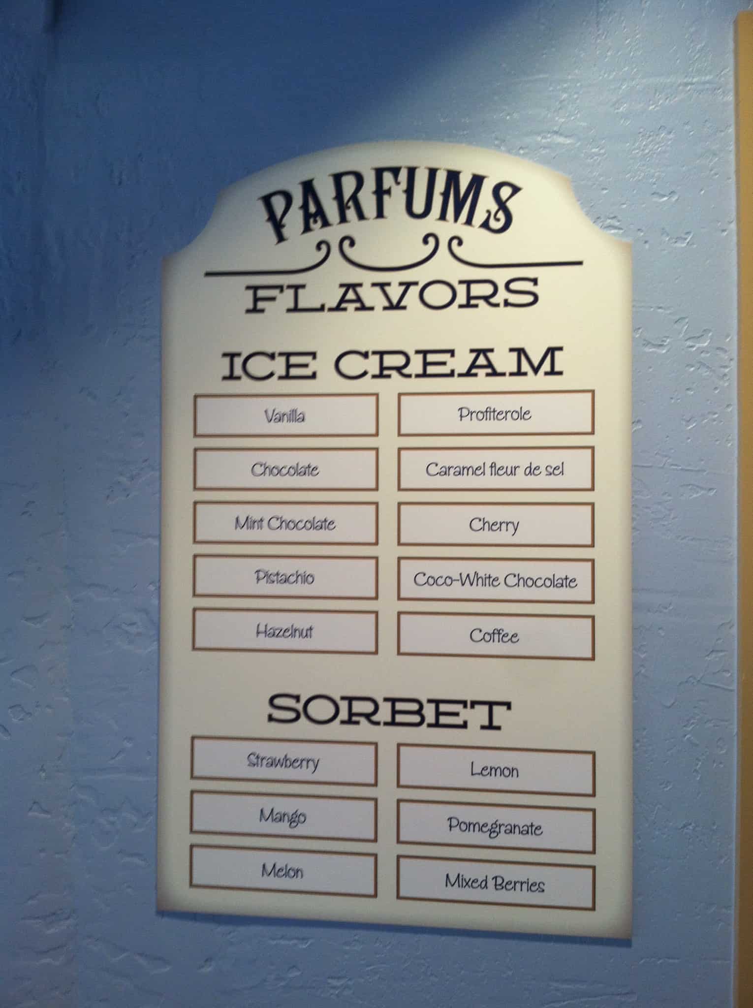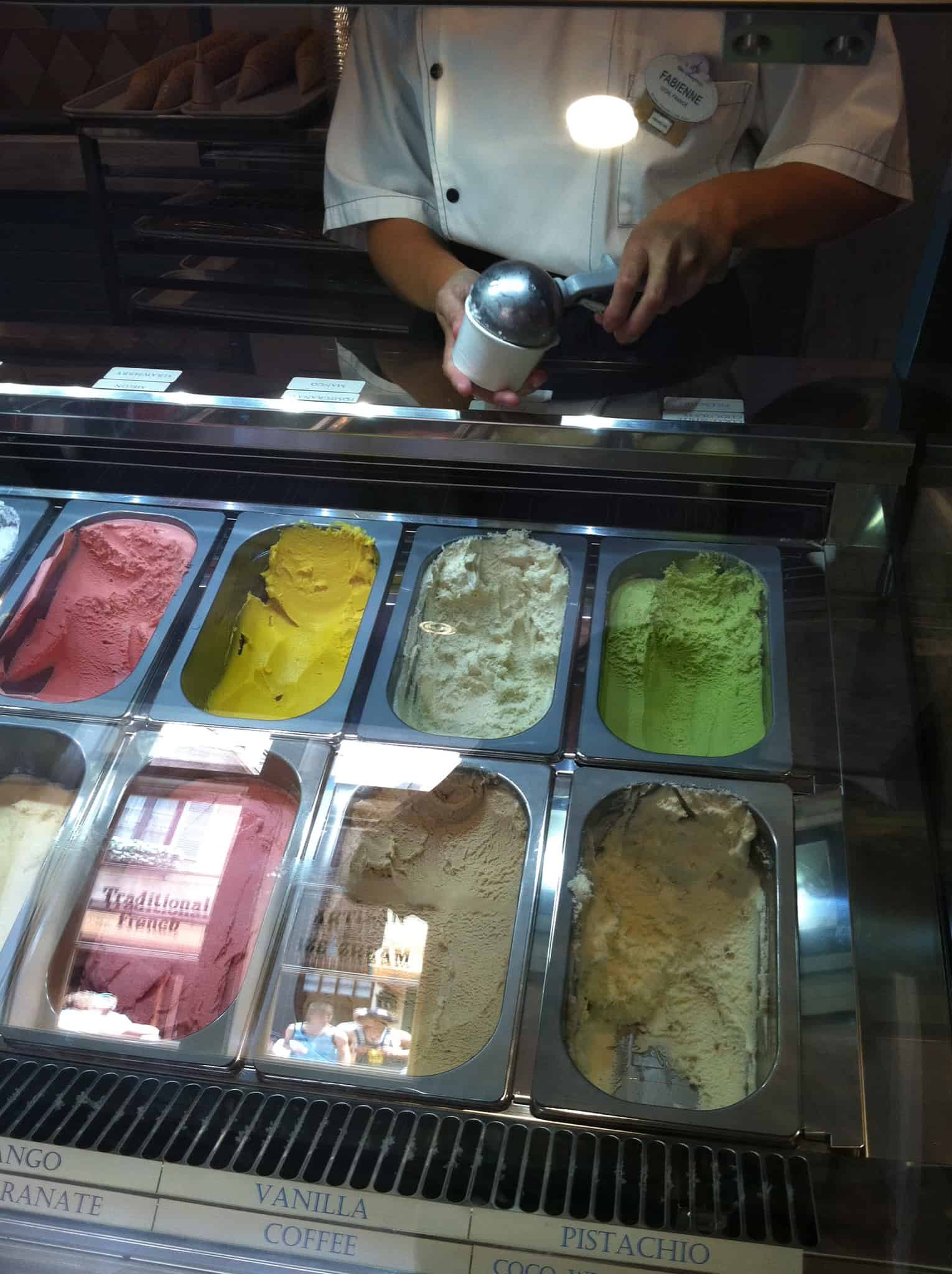 The 16 flavors available at L’Artisan des Glaces are: Vanilla, Chocolate, Mint Chocolate, Pistachio, Hazelnut, Profiterole, Caramel fleur de sel (salted caramel), Cherry, Coco-White Chocolate, Coffee, and 6 sorbet flavors: Strawberry, Mango, Melon, Lemon, Pomegranate, and Mixed Berries. These flavors are made in-house and may change periodically – I’m hoping for fun seasonal options.
